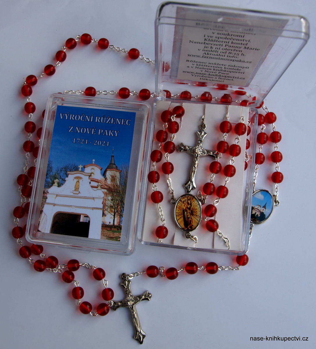 Červené perle ketlovaného růžence (na kovových očkách) mají velikost 7 mm. Jedná se o produkt českých firem, ručně vyráběný.